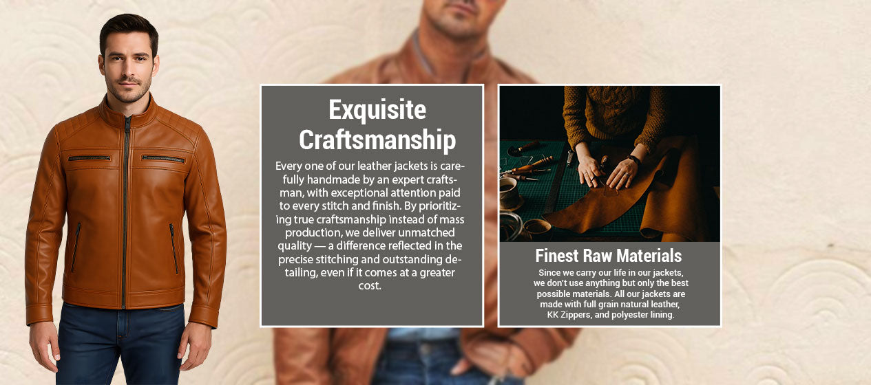 We begin with the best natural full-grain and top-grain hides that offer durability, strength, and comfort. Unlike imitation or split leather, ours grows richer with age, giving every jacket a character as unique as the person wearing it.