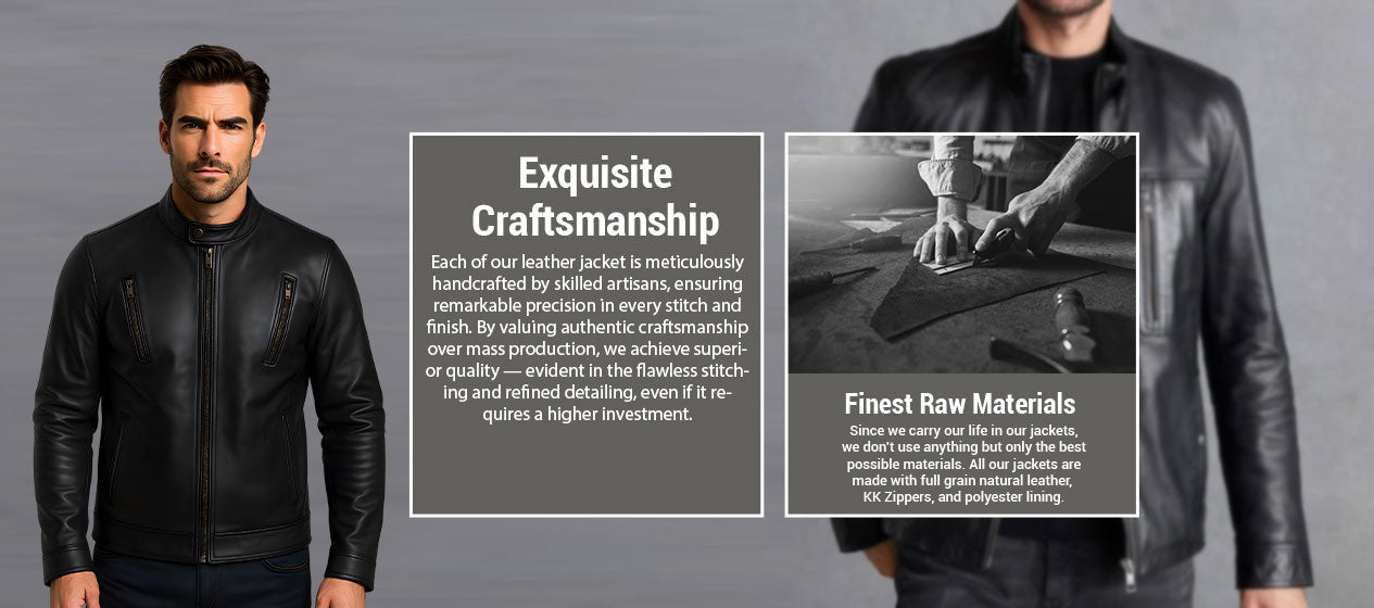 We begin with the best natural full-grain and top-grain hides that offer durability, strength, and comfort. Unlike imitation or split leather, ours grows richer with age, giving every jacket a character as unique as the person wearing it.