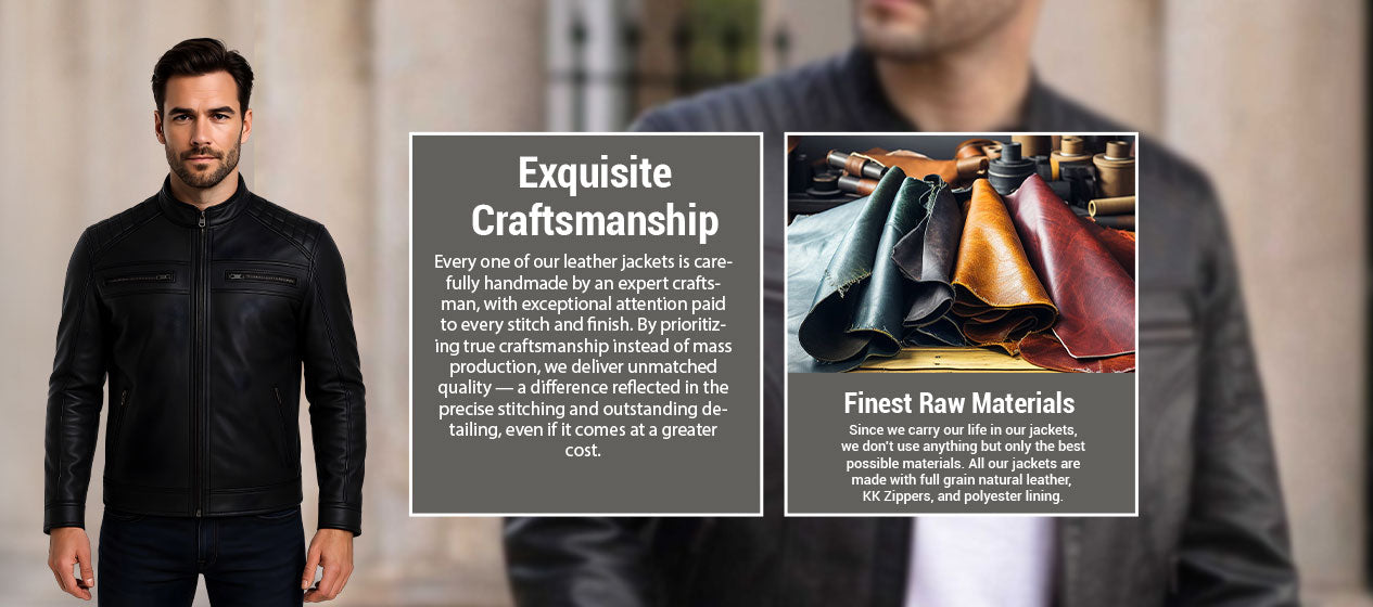 We begin with the best natural full-grain and top-grain hides that offer durability, strength, and comfort. Unlike imitation or split leather, ours grows richer with age, giving every jacket a character as unique as the person wearing it.