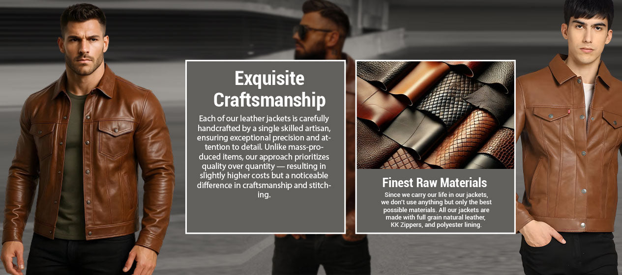 We begin with the best natural full-grain and top-grain hides that offer durability, strength, and comfort. Unlike imitation or split leather, ours grows richer with age, giving every jacket a character as unique as the person wearing it.