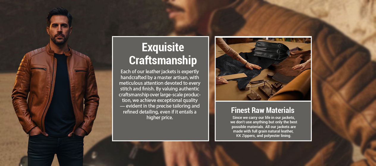We begin with the best natural full-grain and top-grain hides that offer durability, strength, and comfort. Unlike imitation or split leather, ours grows richer with age, giving every jacket a character as unique as the person wearing it.